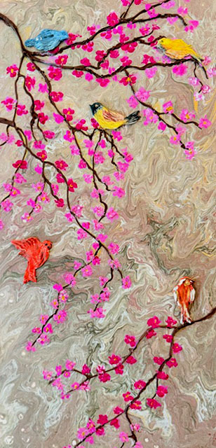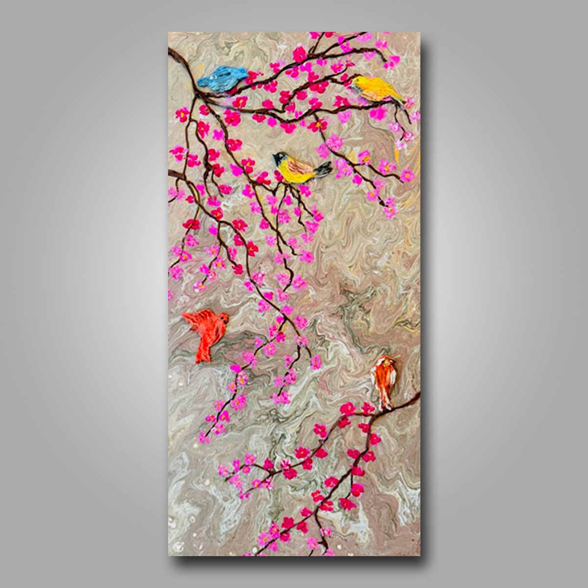 This vibrant and enchanting painting captures the essence of spring with its delicate portrayal of cherry blossoms and colorful birds. The artwork features graceful branches adorned with vivid pink cherry blossoms against a swirling, textured background in soft neutral tones.
